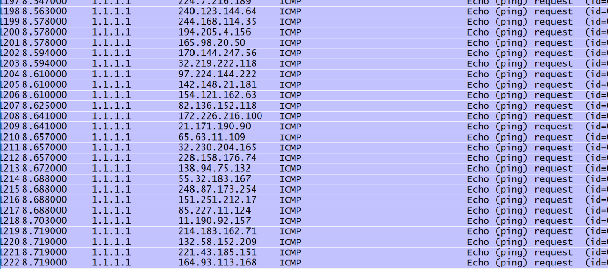 使用WireShark来捕获发出的数据包,可以看到快速地以1.1.1.1向各个地址发送ICMP请求,这个地址在收到了请求之后,很快就会向1.1.1.1发回应答。这就是第三种攻击方式