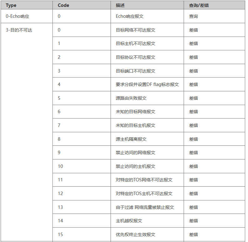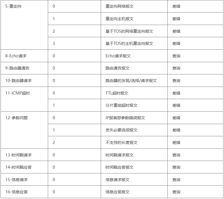 不同的Type和Code值表示不同的ICMP报文类型,对应了数据包处理过程中可能出现的不同错误情况,不同类型的ICMP报文又分为差错报文和查询报文两种。