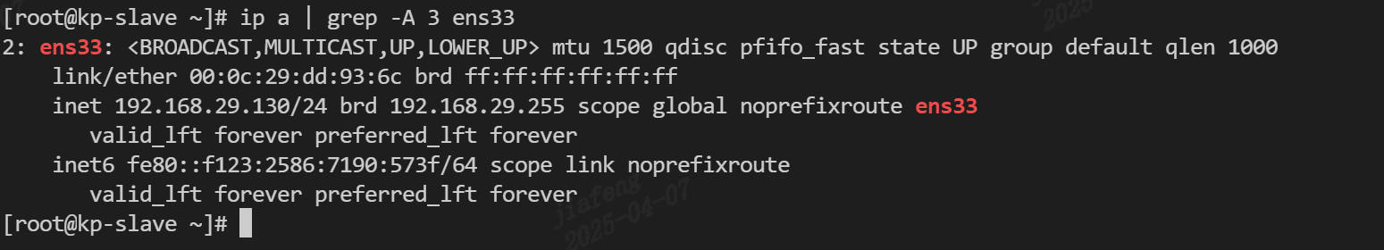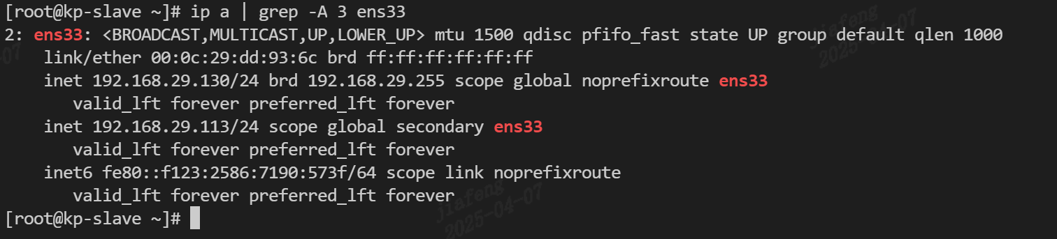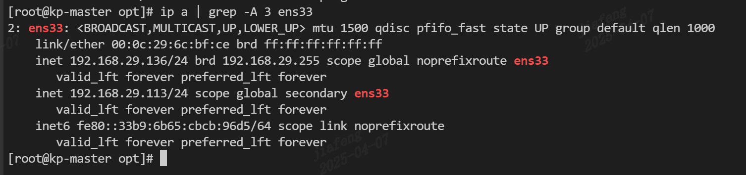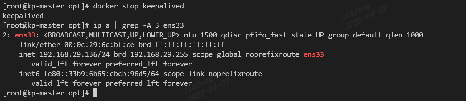 可以看到vip在KP-master的ens33上启动了,跟我们配置的一样。