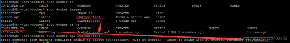 此时发现删除失败,根据提示信息可以知道,当前我们要删除的镜像正在被已停止id为"a4516aee2e7a"的容器所使用,所以我们必须先删除这个已停止的容器,才可以删除镜像。