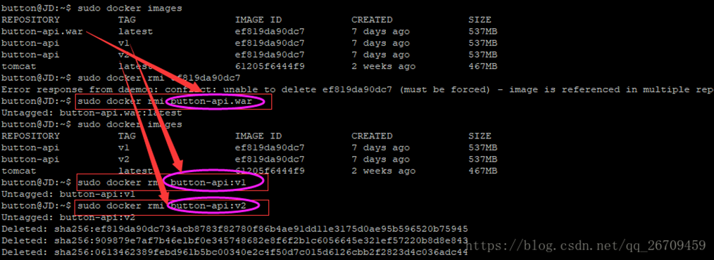在删除时还可能遇到如下情况,多个镜像id相同,此时删除也会不成功: