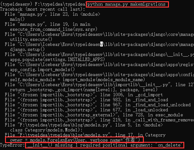 Django在根据models生成数据库表时报 __init__() missing 1 required positional argument: 'on_delete'