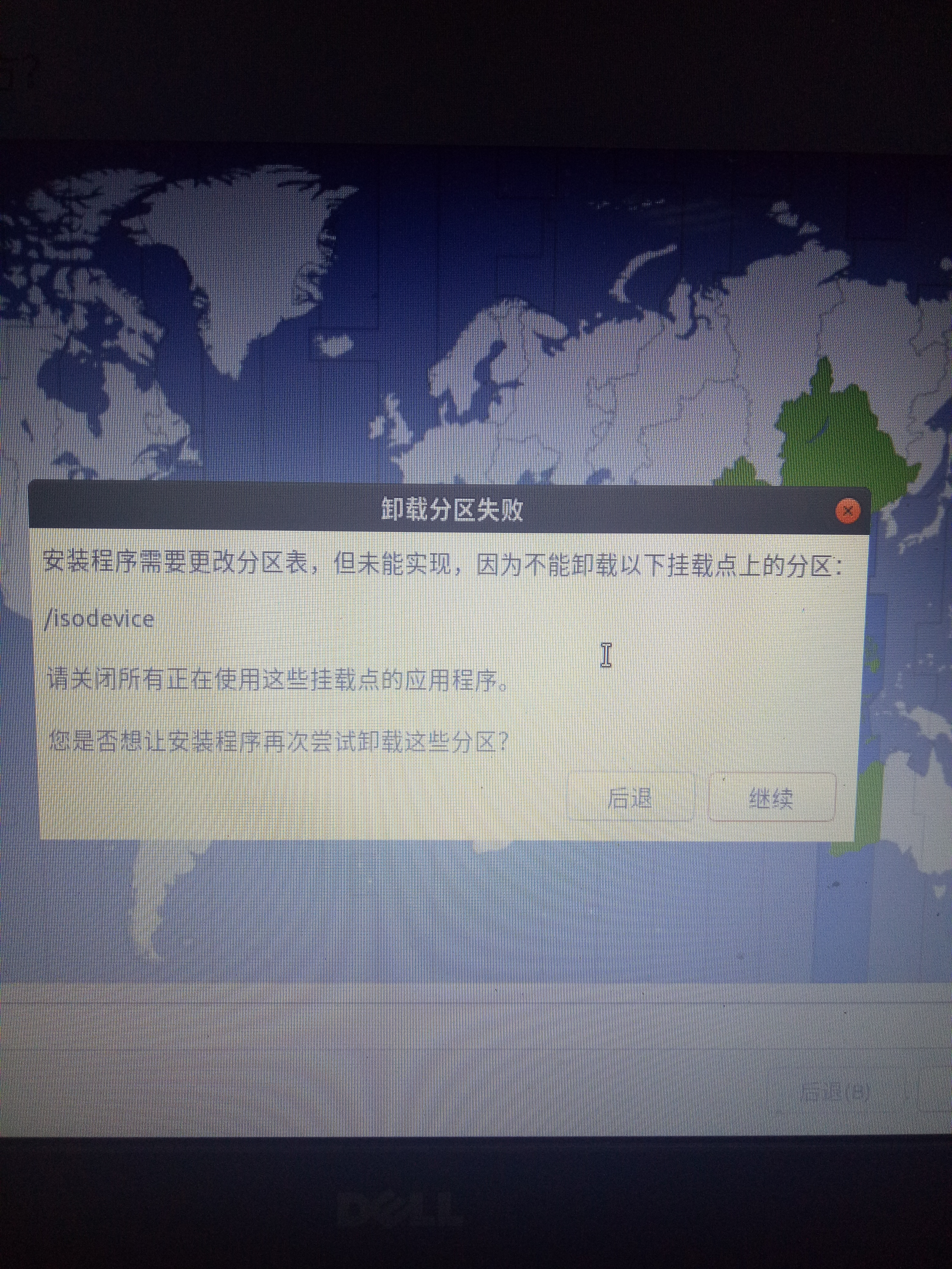 如果你是像我一样第一次安装失败了,那么你第二次安装的时候很可能碰到“卸载分区失败”这样的问题,如下图