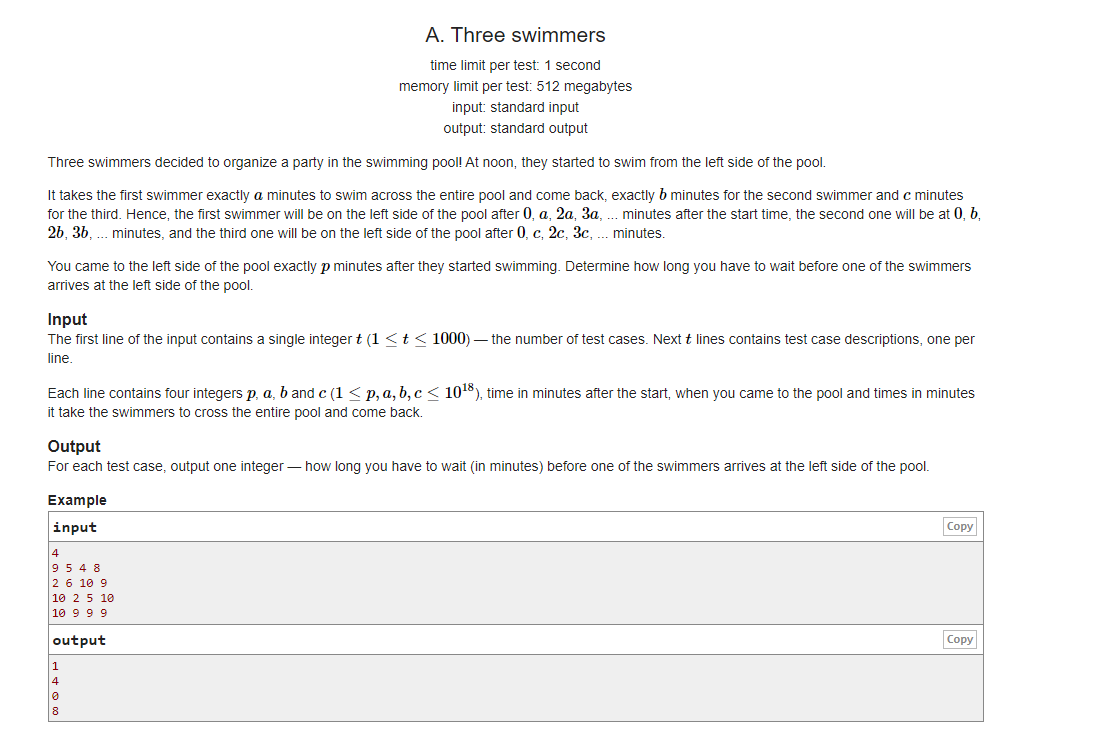 题意:给四个正整数p,a,b,c 。有三位游泳的人分别在0,a ,2a,3a....;0,b,2b,3b....;0,c,2c,3c.... 的时间来到岸边,另一人将会在P的时间时来到岸边,问p要等多久才能等到至少一个人。