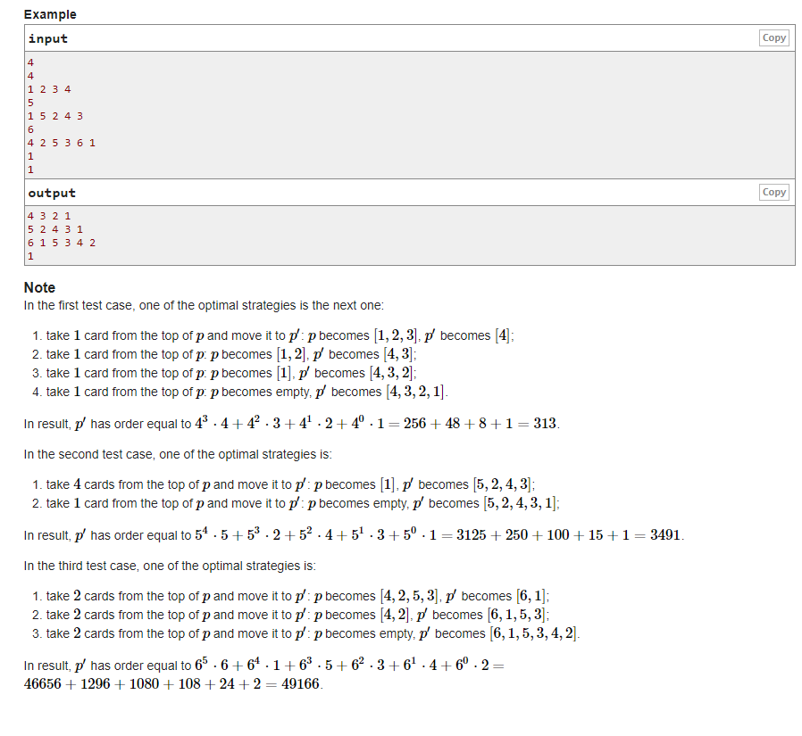 #include<iostream> typedef long long ll; #define rep(a,n) for(a=1;a<=n;++a) const ll maxn = 1e5 + 5; using namespace std; int sz[maxn], ans[maxn]; struct p { int index;//储存数在sz数组中的下标 bool us = false;//判断这个数是否被用过 }po[maxn]; int main() { ios::sync_with_stdio(false); ll t, n, i, j, temp; cin >> t; while (t--) { cin >> n; rep(i,n)po[i].us = false; temp = n; int cnt = 0, cou = 0; rep(i,n) { cin >> sz[i]; po[sz[i]].index = i; } for (i = n; i > 0; i--) { if (!po[i].us) { for (j = po[i].index; j <= temp; ++j) { ans[cou++] = sz[j]; po[sz[j]].us = true; } temp = po[i].index - 1;//更新temp } } cout << ans[0]; for (i = 1; i < cou; ++i)cout << " " << ans[i]; cout << endl; } return 0; }