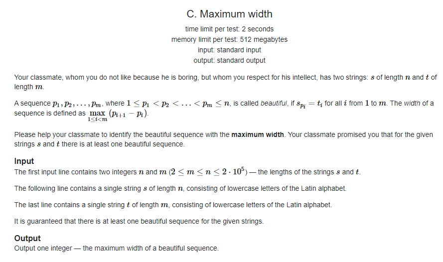 题意:两个字符串a,b,其中b是a的子串,求最大的宽度,宽度的定义如题