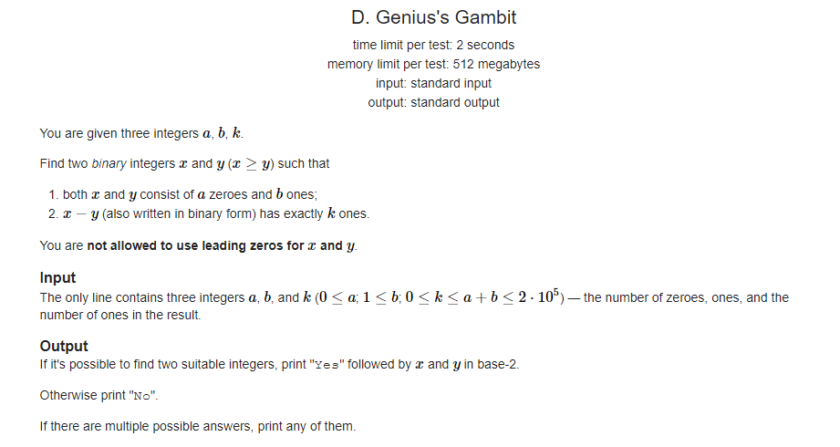 题意: 构造两个二进制的数,两个数均含有a个0,b个1,它们的差(二进制形式)中含有k个0。PS:所有数中均不可有前导零。