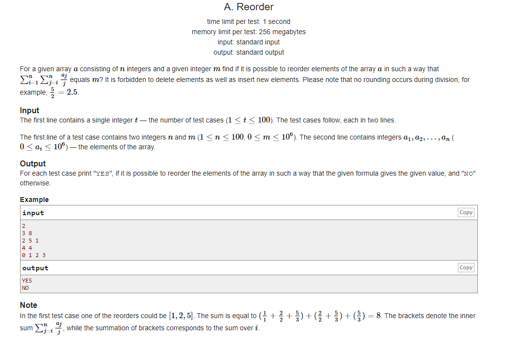 #include<iostream> #include<cstring> #include<cmath> #include<algorithm> #define rep(i,n) for(i=1;i<=n;++i) #define ms(a,n) memset(a,n,sizeof(a)) #define maxn 100005+5 #define inf 0x3f3f33f3f using namespace std; typedef long long ll; ll t, n, temp, m, a, b; string s; int main() { cin >> t; ll i; while (t--) { cin >> n >> m; ll sum = 0; rep(i, n) { cin >> temp; sum += temp; } if (sum == m)cout << "YES" << endl; else cout << "NO" << endl; } return 0; }