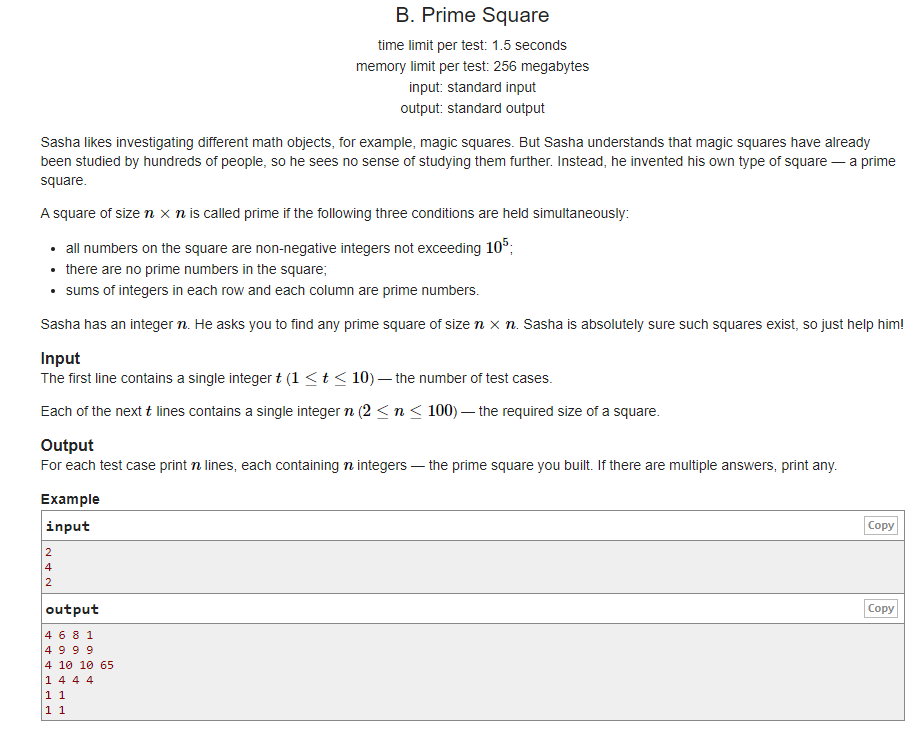 #include<iostream> #include<cstring> #include<cmath> #include<algorithm> #define rep(i,n) for(i=1;i<=n;++i) #define ms(a,n) memset(a,n,sizeof(a)) #define maxn 100005+5 #define inf 0x3f3f33f3f using namespace std; typedef long long ll; ll t, n, temp, m, a, b; bool isp[50005]; int main() { ios::sync_with_stdio(false); ms(isp, true); for (int i = 2; i <= 50000; ++i) { if (isp[i]) { for (int j = 2 * i; j <= 50000; j+=i) { isp[j] = false; } } } isp[0] = isp[1] = false; cin >> t; ll i; while (t--) { cin >> n; for (int i = 1;; ++i) { if (!isp[i]) { if (isp[(n - 1) * i + 1]) { temp = i; break; } } } for (i = 1; i <= n; i++) { if (i == 1)cout << 1; else cout << temp; for (int j = 2; j <= n; ++j) { if (i == j)cout << " " << 1; else cout << " " << temp; } cout << endl; } cout << endl; } return 0; }