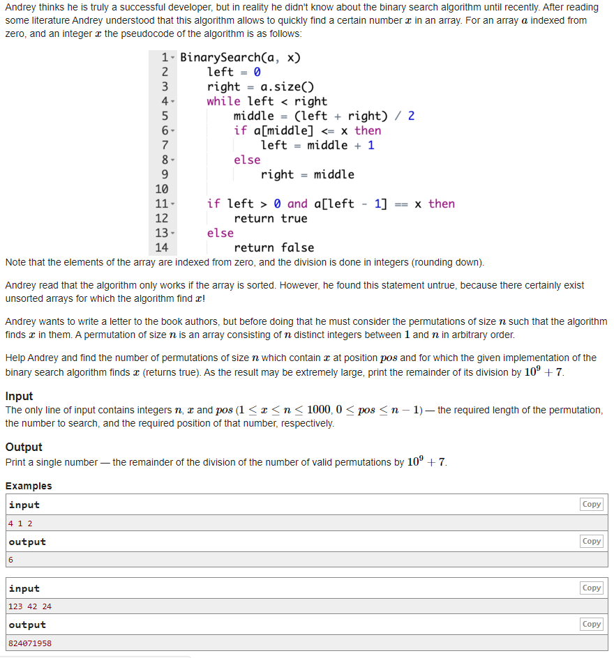 #include<iostream> using namespace std; typedef long long ll; ll mod = 1e9 + 7; ll n, x, pos, l, r, a = 0, b = 0, ans = 1; int main(){ ios::sync_with_stdio(false); cin >> n >> x >> pos; l = 0; r = n; while (l < r) { ll mid = (l + r) >> 1; if (mid == pos) l = mid + 1; else if (mid > pos) { r = mid; a++; } else if (mid < pos) { l = mid + 1; b++; } } if (b >= x || a > n - x) cout << 0 << endl; else { for (ll i = x - 1, j = 1; j <= b; i--, j++) ans = (ans * i) % mod; for (ll i = n - x, j = 1; j <= a; i--, j++) ans = (ans * i) % mod; for (ll i = 1; i <= n - a - b - 1; i++) ans = (ans * i) % mod; cout << ans << endl; } return 0; }