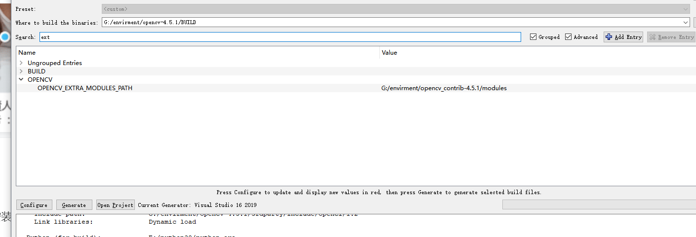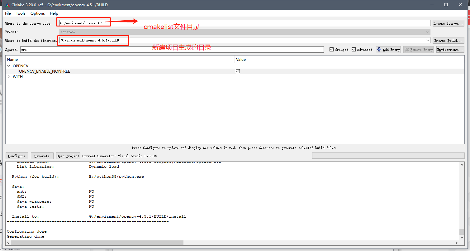 编译输出路径“build the binaries”,本文新建文件夹“BUILD”路径为G:\envirment\opencv-4.5.1\BUILD,同样这个需要按照你的路径自行选择。