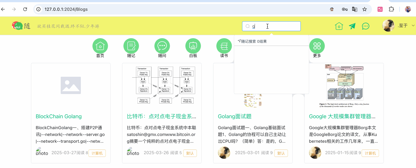 [ 用户输入关键词 "golang" ] ↓ [ Vue 前端 ] ↓ /search/blog?q=golang ↓ [ Golang 后端调用 ES 查询 + 高亮] ↓ [ Elasticsearch 返回文档列表 ] ↓ [ Vue 展示博客标题 + 摘要 + 图片 ]