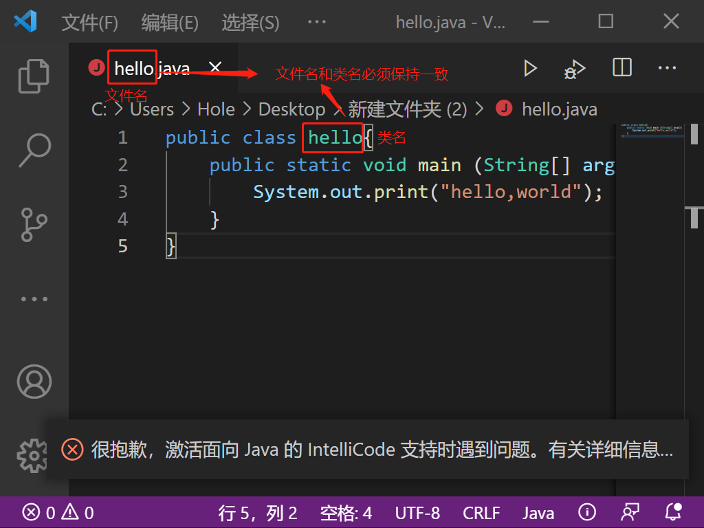 2.新建一个java文件,命名为“hello”,后缀为java,并用编程软件打开
