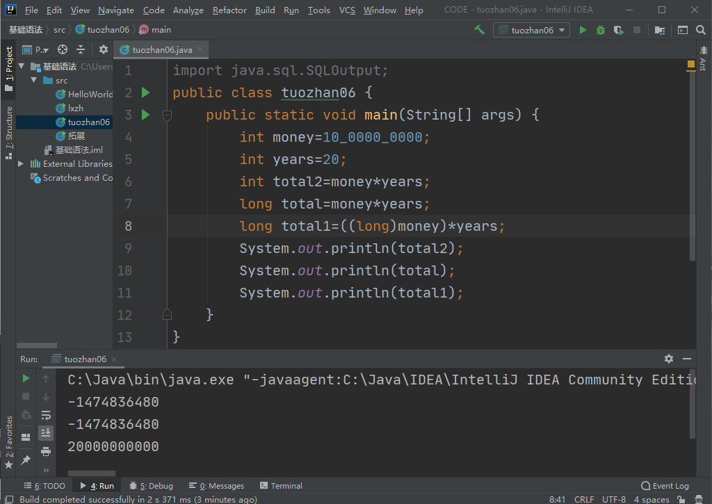 - **图中的变量money和years都属于int类型,而两者作运算得出的结果也默认会的int类型,而money*years得出的结果明显超出int字节范围,即内存溢出。**