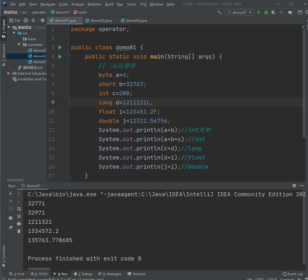按照数据类型转换优先级,在运算的变量中只有byte、short、int这三种中的两种,则计算结果默认为int类型。当参与运算的变量中有long、float、double时,运算结果类型默认为优先级较高的类型。