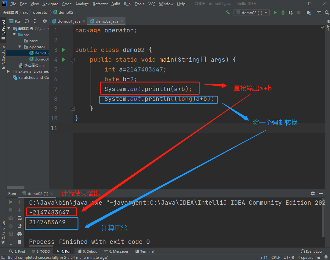 而当运算结果超过默认类型字节范围,即内存溢出时,需要强制转换一个变量为优先级更高的类型,才能得出正常结果。