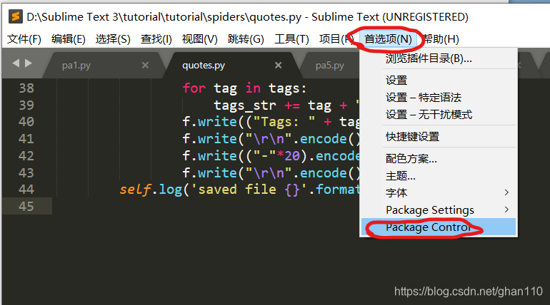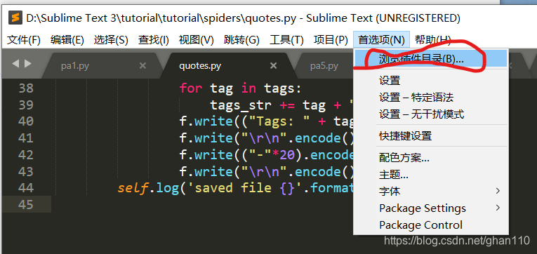 2、点击第一个链接后会下载好Package Control包,将Package Control包移到安装文件下的Installed Packages,第一步点击首选项的,浏览插件目录。
