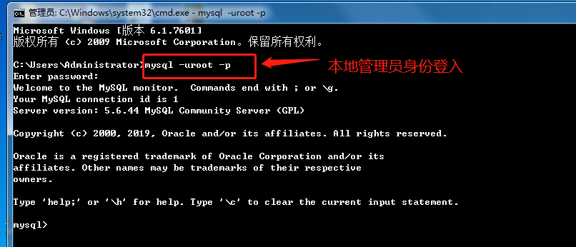 1.先启动服务端 2.客户端登录服务端 mysql # 游客模式登录 功能及权限少 3.退出游客账户采用管理员账户登录 exit\quit # 完整命令 mysql -h 127.0.0.1 -P 3306 -uroot -p # 本地操作可以简化 mysql -uroot -p