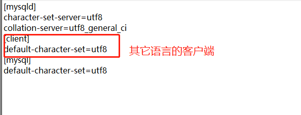 2.在该文件内拷贝几行固定的配置 [mysqld] character-set-server=utf8 collation-server=utf8_general_ci [client] default-character-set=utf8 [mysql] default-character-set=utf8