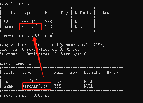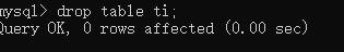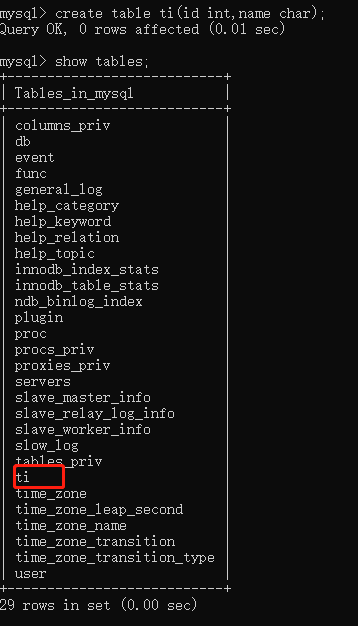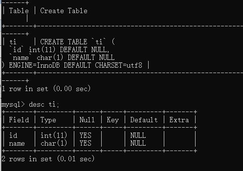 create table ti(id int,name char); # 创建表(必须有字段名和类型)