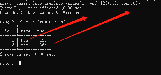 insert into t1 values(1,'ben',123); # 插入数据 insert into t1 values(1,'ben',123),(2,'tom',666); # 插入多条数据