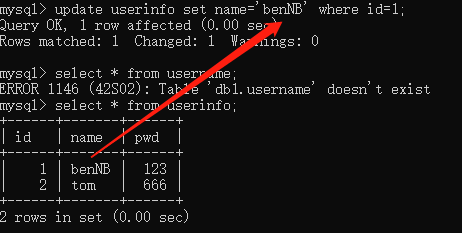 update userinfo set name='benNB' where id=1; # 将id是1的数据的name字段改为benNB