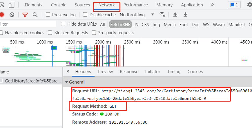 import requests res = requests.get('http://tianqi.2345.com/Pc/GetHistory?areaInfo%5BareaId%5D=60010&areaInfo%5BareaType%5D=2&date%5Byear%5D=2021&date%5Bmonth%5D=8') real_data_html = res.json().get('data') print(real_data_html)