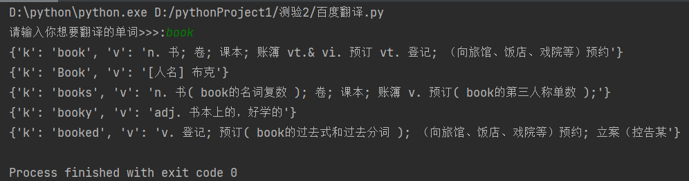 import requests keyword = input('请输入你想要翻译的单词>>>:') res = requests.post('https://fanyi.baidu.com/sug', data={'kw':keyword} ) data_list = res.json().get('data') for d in data_list: print(d)