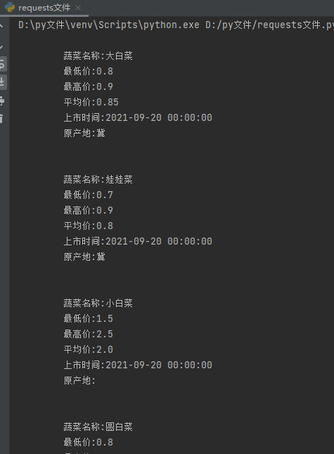 import requests import time def get_price_data(n): res = requests.post('http://www.xinfadi.com.cn/getPriceData.html', data={ "limit": '', "current": n, "pubDateStartTime": '', "pubDateEndTime": '', "prodPcatid": '', "prodCatid": '', "prodName": '', } ) data_list = res.json().get('list') for d in data_list: pro_name = d.get('prodName') low_price = d.get('lowPrice') high_price = d.get('highPrice') avg_price = d.get('avgPrice') pub_date = d.get('pubDate') source_place = d.get('place') print(""" 蔬菜名称:%s 最低价:%s 最高价:%s 平均价:%s 上市时间:%s 原产地:%s """ % (pro_name, low_price, high_price, avg_price, pub_date, source_place)) time.sleep(1) """涉及到多页数据爬取的时候 最好不要太频繁 可以自己主动设置延迟""" for i in range(1, 5): time.sleep(1) get_price_data(i)