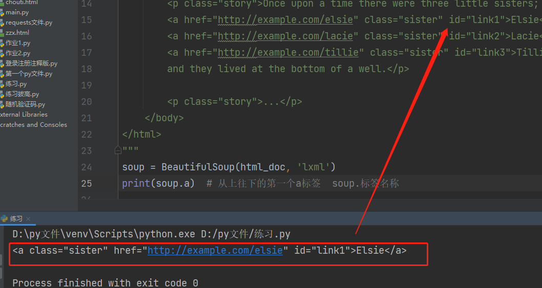 # 1.构造一个bs4解析器对象 soup = BeautifulSoup(html_doc, 'lxml') # 2.利用对象的内置方法完成一系列操作 '''必须要掌握''' print(soup.a) # 从上往下的第一个a标签 soup.标签名称