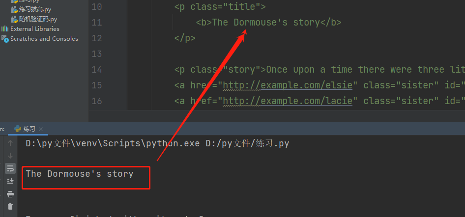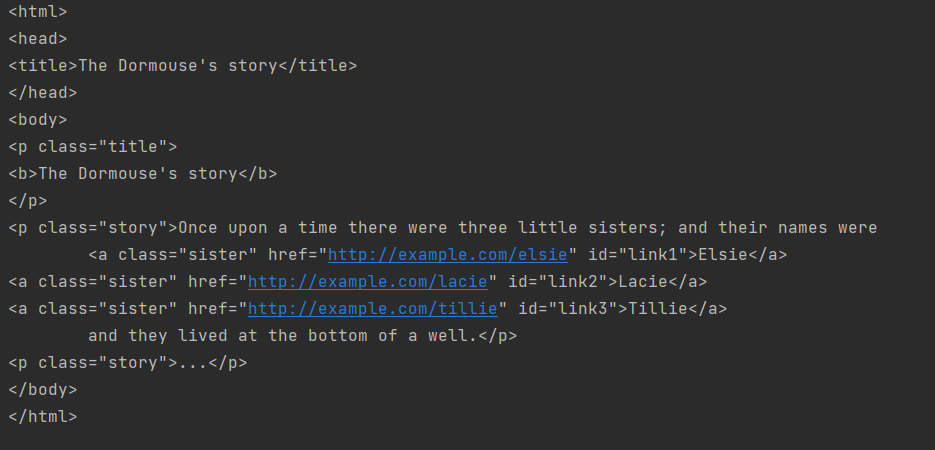 from bs4 import BeautifulSoup # 构造一个网页数据 html_doc = """ <html> <head> <title>The Dormouse's story</title> </head> <body> <p class="title"> <b>The Dormouse's story</b> </p> <p class="story">Once upon a time there were three little sisters; and their names were <a href="http://example.com/elsie" class="sister" id="link1">Elsie</a> <a href="http://example.com/lacie" class="sister" id="link2">Lacie</a> <a href="http://example.com/tillie" class="sister" id="link3">Tillie</a> and they lived at the bottom of a well.</p> <p class="story">...</p> </body> </html> """