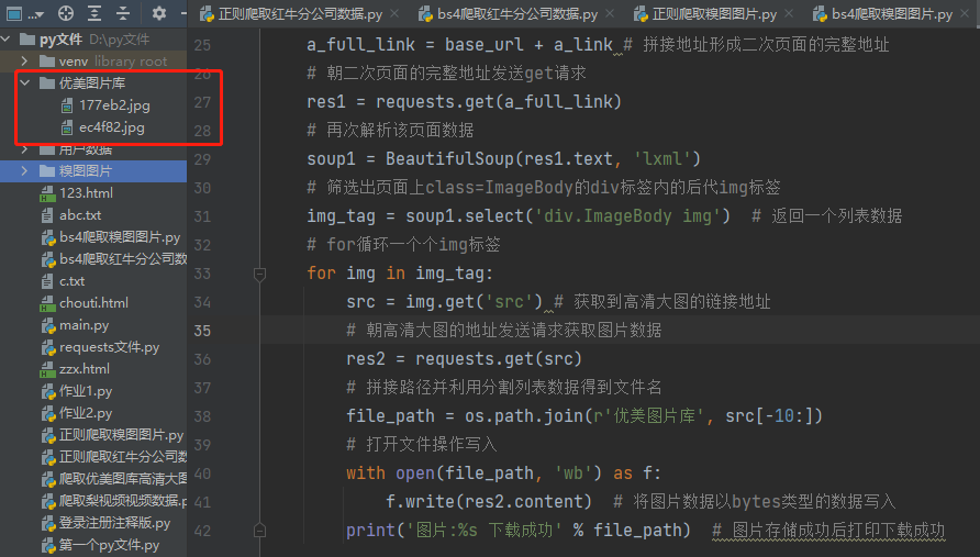 # 朝主页面发送get请求 # 获取二次详情页地址链接 # 由于页面上有很多列表标签 我们需要先进行区分 所以先找上一层div标签 # 先获取所有的li标签 # for循环一个个li标签 获取内部a标签 # 提前定义根目录地址 # 朝一个个链接地址发送请求 # 筛选出页面上的图片src地址 # 朝高清图大图的地址发送请求获取图片数据