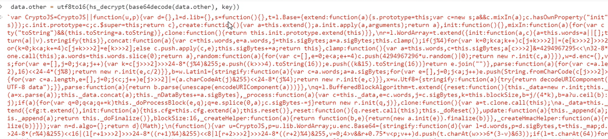 utf8to16(hs_decrypt(base64decode(data.other), key)) 解密之后是一段js代码