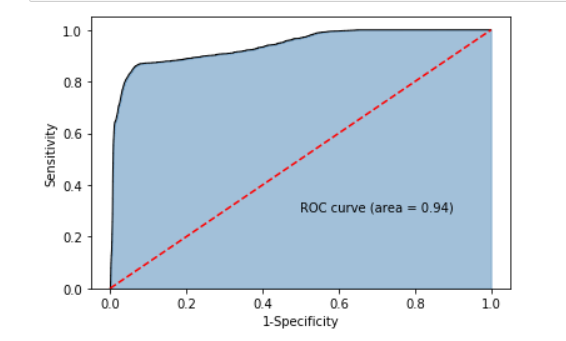 # 计算正例Positive所对应的概率,用于生成ROC曲线的数据 y_score = bnb.predict_proba(X_test)[:,1] fpr,tpr,threshold = metrics.roc_curve(y_test.map({'Negative':0,'Positive':1}), y_score) # 计算AUC的值 roc_auc = metrics.auc(fpr,tpr) # 绘制面积图 plt.stackplot(fpr, tpr, color='steelblue', alpha = 0.5, edgecolor = 'black') # 添加边际线 plt.plot(fpr, tpr, color='black', lw = 1) # 添加对角线 plt.plot([0,1],[0,1], color = 'red', linestyle = '--') # 添加文本信息 plt.text(0.5,0.3,'ROC curve (area = %0.2f)' % roc_auc) # 添加x轴与y轴标签 plt.xlabel('1-Specificity') plt.ylabel('Sensitivity') # 显示图形 plt.show()