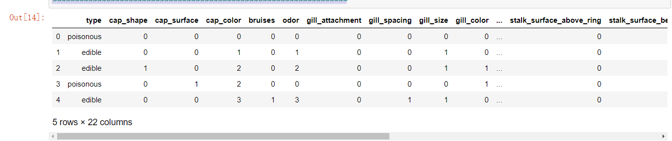 # 将字符型数据作因子化处理,将其转换为整数型数据 columns = mushrooms.columns[1:] for column in columns: mushrooms[column] = pd.factorize(mushrooms[column])[0] mushrooms.head()