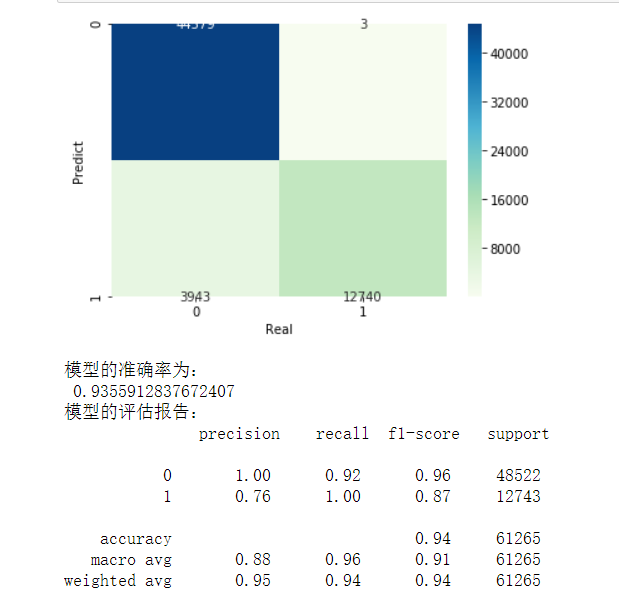 from sklearn import model_selection # 将数据集拆分为训练集合测试集 Predictors = mushrooms.columns[1:] X_train,X_test,y_train,y_test = model_selection.train_test_split(mushrooms[Predictors], mushrooms['type'], test_size = 0.25, random_state = 10) from sklearn import naive_bayes from sklearn import metrics import seaborn as sns import matplotlib.pyplot as plt # 构建多项式贝叶斯分类器的“类” mnb = naive_bayes.MultinomialNB() # 基于训练数据集的拟合 mnb.fit(X_train, y_train) # 基于测试数据集的预测 mnb_pred = mnb.predict(X_test) # 构建混淆矩阵 cm = pd.crosstab(mnb_pred,y_test) # 绘制混淆矩阵图 sns.heatmap(cm, annot = True, cmap = 'GnBu', fmt = 'd') # 去除x轴和y轴标签 plt.xlabel('Real') plt.ylabel('Predict') # 显示图形 plt.show() # 模型的预测准确率 print('模型的准确率为:\n',metrics.accuracy_score(y_test, mnb_pred)) print('模型的评估报告:\n',metrics.classification_report(y_test, mnb_pred))
