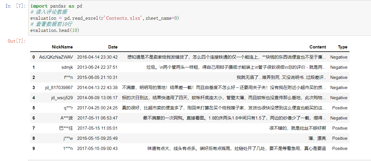 # 导入第三方包 from sklearn.feature_extraction.text import CountVectorizer # 计算每个词在各评论内容中的次数,并将稀疏度为99%以上的词删除 counts = CountVectorizer(min_df = 0.01) # 文档词条矩阵 dtm_counts = counts.fit_transform(words).toarray() # 矩阵的列名称 columns = counts.get_feature_names() # 将矩阵转换为数据框--即X变量 X = pd.DataFrame(dtm_counts, columns=columns) # 情感标签变量 y = evaluation.Type X.head()