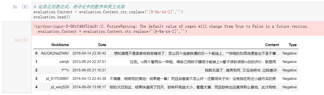 import jieba # 加载自定义词库 jieba.load_userdict(r'all_words.txt') # 读入停止词 with open(r'mystopwords.txt', encoding='UTF-8') as words: stop_words = [i.strip() for i in words.readlines()] # 构造切词的自定义函数,并在切词过程中删除停止词 def cut_word(sentence): words = [i for i in jieba.lcut(sentence) if i not in stop_words] # 切完的词用空格隔开 result = ' '.join(words) return(result) # 对评论内容进行批量切词 words = evaluation.Content.apply(cut_word) # 前5行内容的切词效果 words[:5]