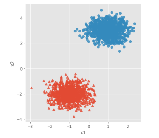 # 导入第三方模块 import pandas as pd import numpy as np from sklearn.datasets.samples_generator import make_blobs import matplotlib.pyplot as plt import seaborn as sns from sklearn import cluster # 模拟数据集 X,y = make_blobs(n_samples = 2000, centers = [[-1,-2],[1,3]], cluster_std = [0.5,0.5], random_state = 1234) # 将模拟得到的数组转换为数据框,用于绘图 plot_data = pd.DataFrame(np.column_stack((X,y)), columns = ['x1','x2','y']) # 设置绘图风格 plt.style.use('ggplot') # 绘制散点图(用不同的形状代表不同的簇) sns.lmplot('x1', 'x2', data = plot_data, hue = 'y',markers = ['^','o'], fit_reg = False, legend = False) # 显示图形 plt.show()