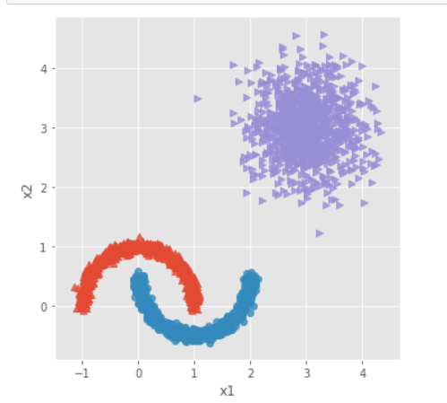 # 导入第三方模块 from sklearn.datasets.samples_generator import make_moons # 构造非球形样本点 X1,y1 = make_moons(n_samples=2000, noise = 0.05, random_state = 1234) # 构造球形样本点 X2,y2 = make_blobs(n_samples=1000, centers = [[3,3]], cluster_std = 0.5, random_state = 1234) # 将y2的值替换为2(为了避免与y1的值冲突,因为原始y1和y2中都有0这个值) y2 = np.where(y2 == 0,2,0) # 将模拟得到的数组转换为数据框,用于绘图 plot_data = pd.DataFrame(np.row_stack([np.column_stack((X1,y1)),np.column_stack((X2,y2))]), columns = ['x1','x2','y']) # 绘制散点图(用不同的形状代表不同的簇) sns.lmplot('x1', 'x2', data = plot_data, hue = 'y',markers = ['^','o','>'], fit_reg = False, legend = False) # 显示图形 plt.show()