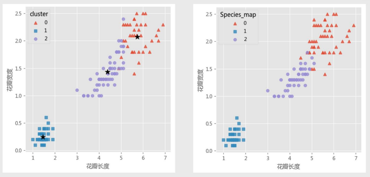 # 绘制聚类效果的散点图 sns.lmplot(x = 'Petal_Length', y = 'Petal_Width', hue = 'cluster', markers = ['^','s','o'], data = X, fit_reg = False, scatter_kws = {'alpha':0.8}, legend_out = False) plt.scatter(centers[:,2], centers[:,3], marker = '*', color = 'black', s = 130) plt.xlabel('花瓣⻓度') plt.ylabel('花瓣宽度') # 图形显示 plt.show() # 增加⼀个辅助列,将不同的花种映射到0,1,2三种值,⽬的是⽅便后⾯图形的对⽐ iris['Species_map'] = iris.Species.map({'virginica':0,'setosa':1,'versicolor':2}) # 绘制原始数据三个类别的散点图 sns.lmplot(x = 'Petal_Length', y = 'Petal_Width', hue = 'Species_map', data = iris, markers = ['^','s','o'],fit_reg = False, scatter_kws = {'alpha':0.8}, legend_out = False) plt.xlabel('花瓣⻓度') plt.ylabel('花瓣宽度') # 图形显示 plt.show()