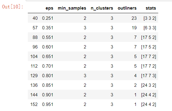 # 构建空列表,用于保存不同参数组合下的结果 res = [] # 迭代不同的eps值 for eps in np.arange(0.001,1,0.05): # 迭代不同的min_samples值 for min_samples in range(2,10): dbscan = cluster.DBSCAN(eps = eps, min_samples = min_samples) # 模型拟合 dbscan.fit(X) # 统计各参数组合下的聚类个数(-1表示异常点) n_clusters = len([i for i in set(dbscan.labels_) if i != -1]) # 异常点的个数 outliners = np.sum(np.where(dbscan.labels_ == -1, 1,0)) # 统计每个簇的样本个数 stats = str(pd.Series([i for i in dbscan.labels_ if i != -1]).value_counts().values) res.append({'eps':eps,'min_samples':min_samples,'n_clusters':n_clusters,'outliners':outliners,'stats':stats}) # 将迭代后的结果存储到数据框中 df = pd.DataFrame(res) df # 根据条件筛选合理的参数组合 df.loc[df.n_clusters == 3, :]