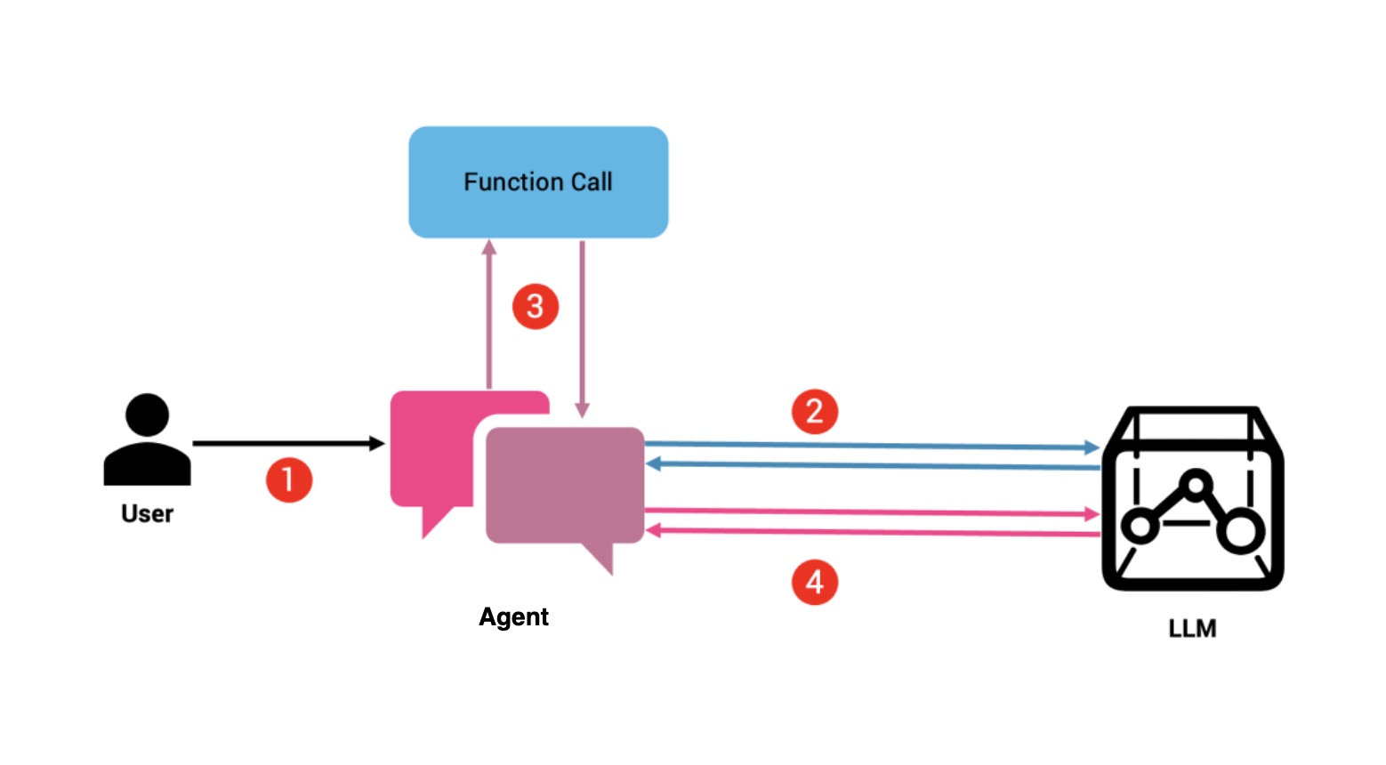 上述三点是一次LLM的调用请求,以问大模型天气预报为例,实际会两次调用LLM(下图步骤2、4),一次调用对应天气API函数(下图步骤3)。