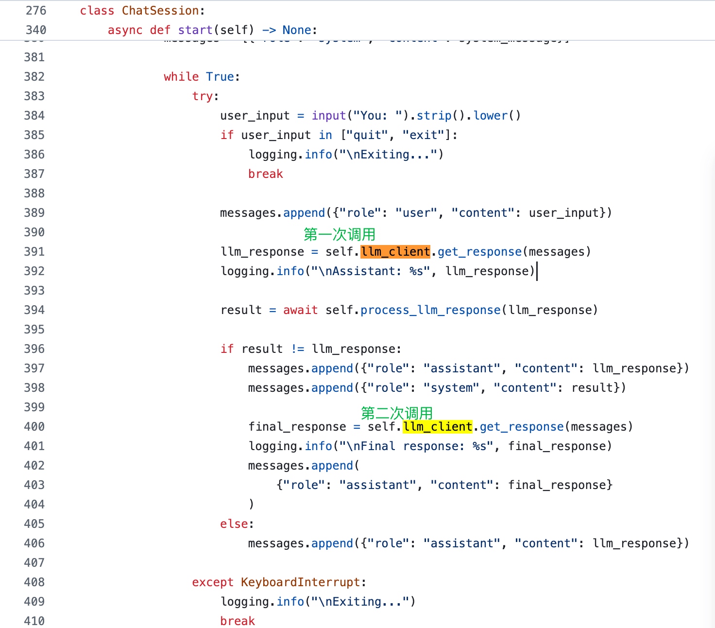 在这个客户端的代码中,我们可以看到对LLM做了两次调用。
