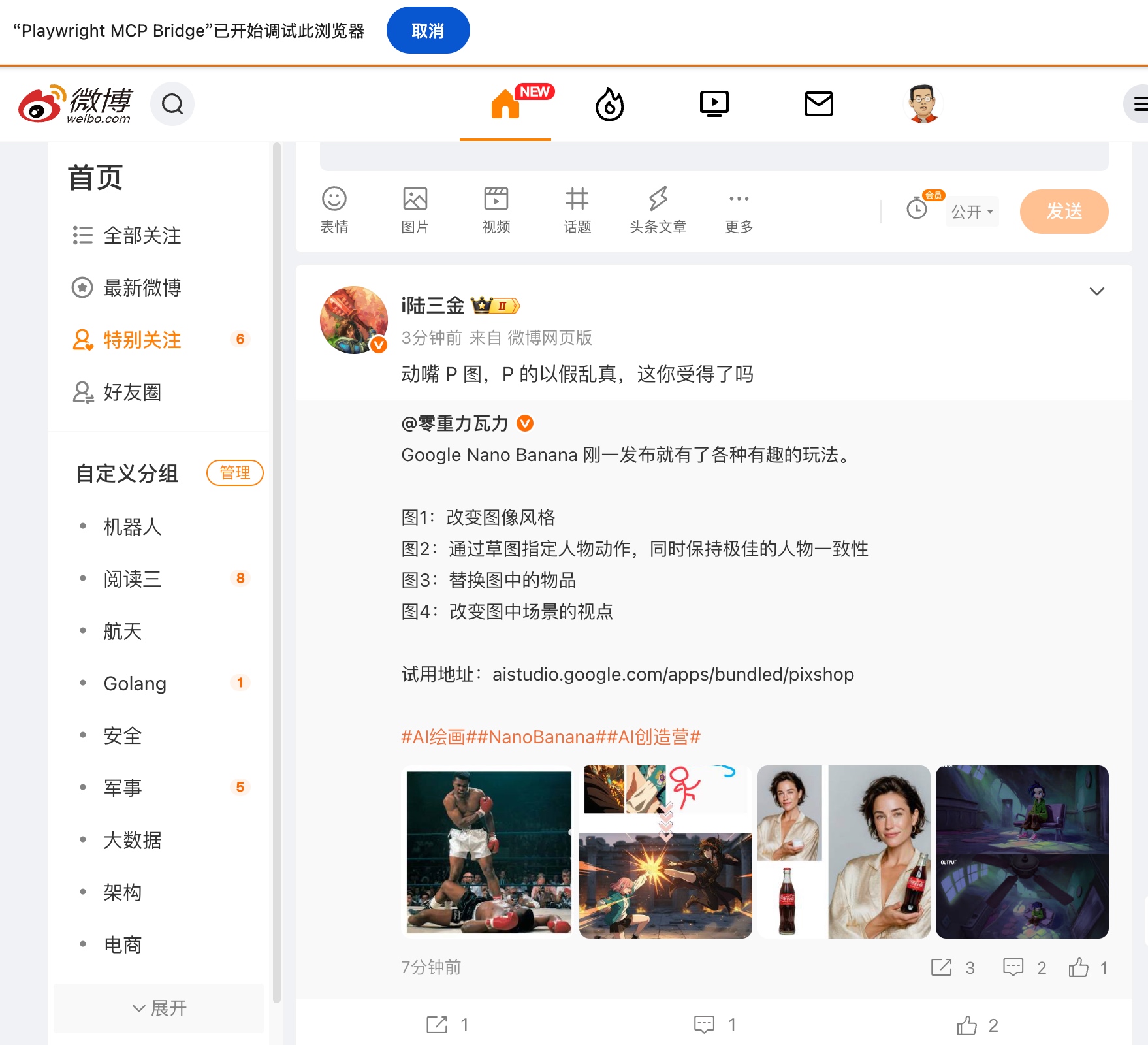 可以看出,Playwright 访问了保持登录态的微博页面,另外AI+Playwright也能从文字理解成对应的网址和点击链接。