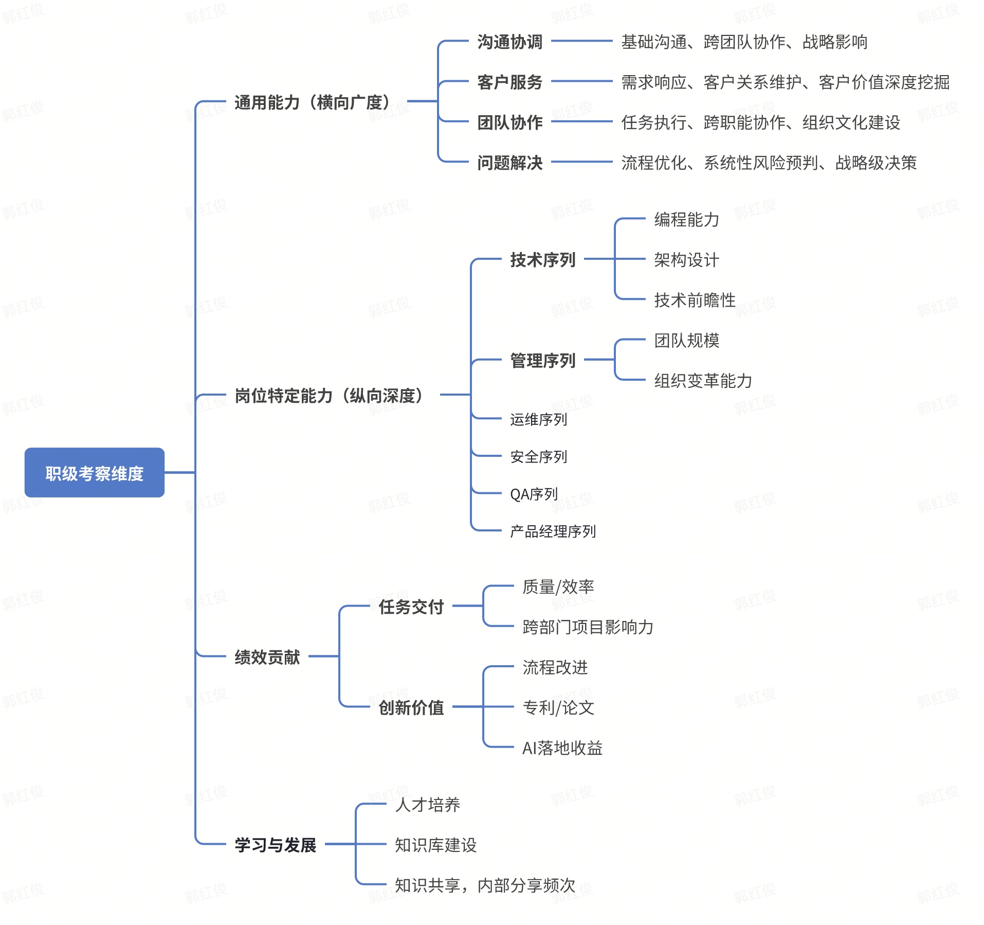 基于上面的认知,职级考察维度包括通用能力、岗位特定能力、绩效贡献、学习及发展四方面。如下面思维导图: