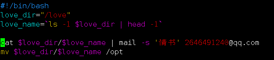编写发送情书的脚本 #!/bin/bash love_dir="/love" love_name=`ls -1 $love_dir | head -1` cat $love_dir/$love_name | mail -s '情书' 2646491240@qq.com mv $love_dir/$love_name /opt ~