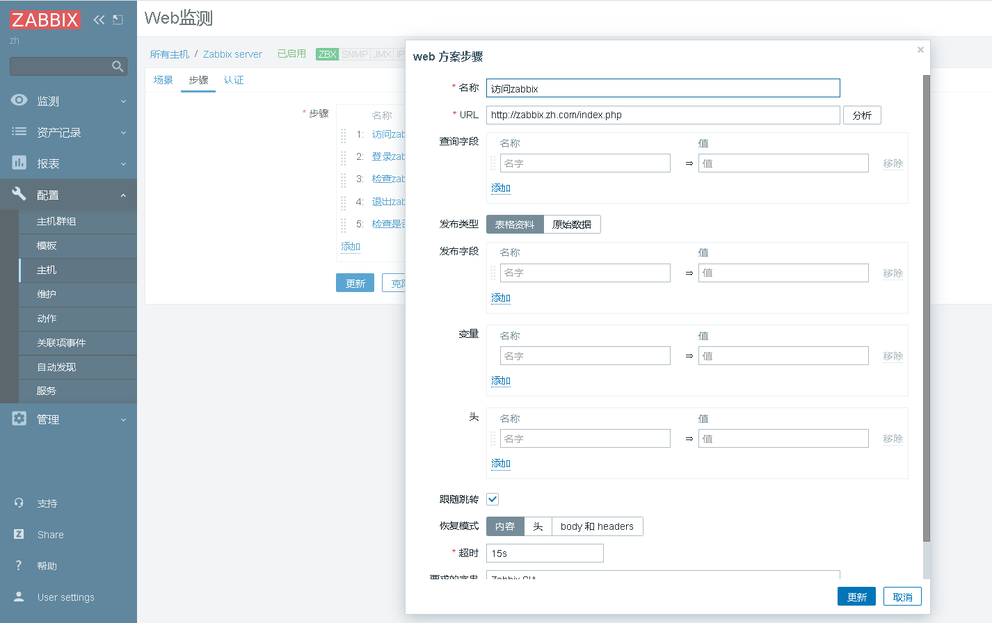 我们使用Zabbix Web 监控来监控Zabbix的Web界面。我们想知道它是否可用、是否正常工作以及响应速度。所以我们必须使用用户名和密码登录。