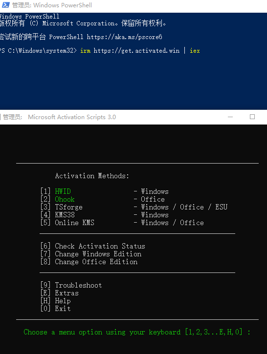 1.在windows搜索栏上,用管理员权限打开powershell,就可以弹出下面界面,切换到下图中目录,然后输出命令:irm https://get.activated.win | iex