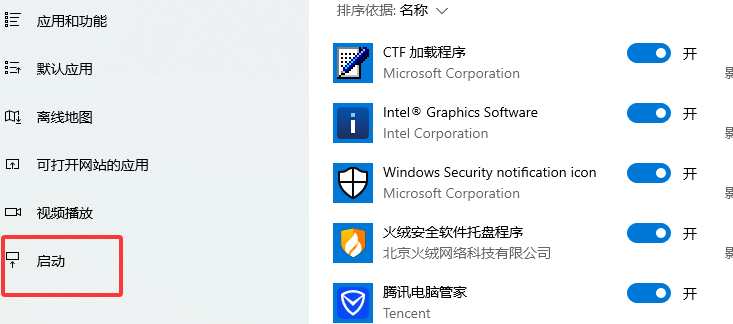 2、在设置里点击“应用”,再点击“启动”,把除杀毒软件跟输入法外的全关闭,这样你的电脑启动比之前快一倍。